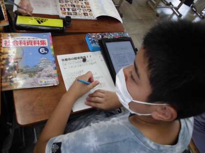 京都に昔からあるモノについて調べています。建造物でも食べものでも習慣でも,とにかく歴史あるモノについて調べています。「何百年も前からあるで!」「徳川って書いてあるで!」などなどいろんな発見がありました。調べ学習は,新たな発見がたくさんあるのでとっても楽しい時間です。