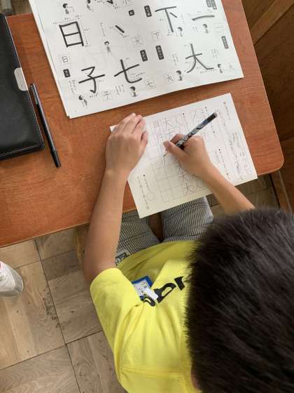 先日,書写では画の方向に気を付けながらていねいに美しい字を書く学習をしました。美しく書くには,「こしピン!足ペタ!グー一つ!」と,姿勢を良くして書くことを意識しました。他にも,えんぴつの正しい持ち方や,書き順はどうだったか復習しながら,今日一番の字を書きました。