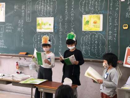 がまくんやかえるくんになりきって,音読をしています。
