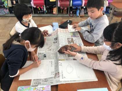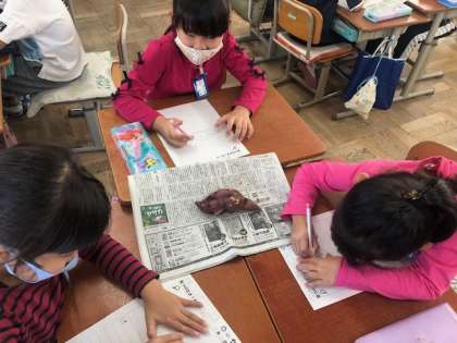 育てていたサツマイモをほり,観察をしました。大きさや形・色やにおいなど,じっくり観察していました。