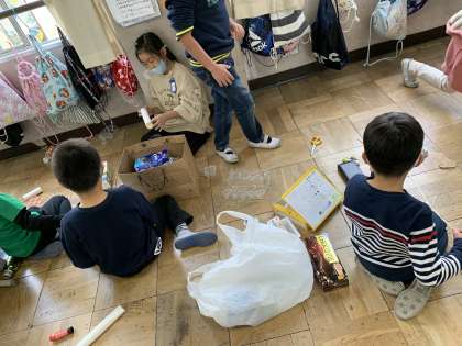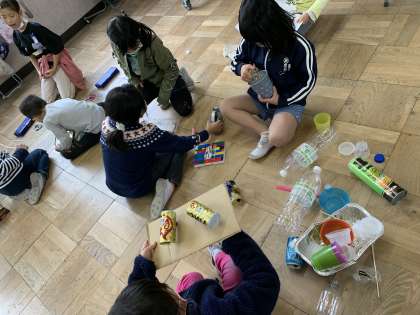 磁石の働きを使って面白い遊びをチームごとに考えていたり,ストローやキャップを使って車を作ったりしています。自分たちで用意した素材をどれだけ工夫できるのかを必死に考えています。