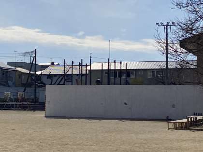 気が付くと体育館工事作業の方々の使っていたプレハブが解体されて行っていました。「どこでもドア」が登場してから半年以上,正門から見えていた白い建物…。私にとっては「体育館工事の象徴」ともいえるプレハブ…。「プレハブ」なんて,人生の打出そんなに口にすることの無い…,縁の遠いものだと思っていたのに…。これといってプレハブに愛着があったわけではないのですが,何度も足を運び,打ち合わせをした場所が無くなっていく様子に,少しセンチメンタルになってしまいまったのはここだけの話…。