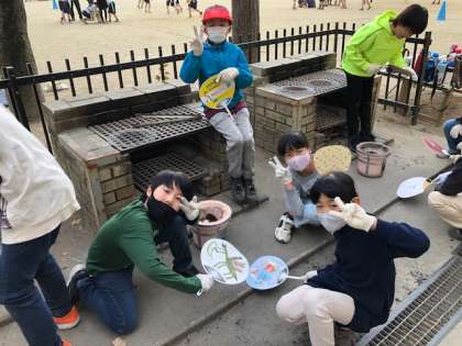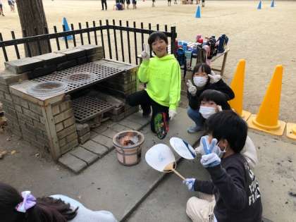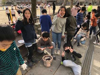 おいしいおもちを食べるために,まずは火おこし!!みんなで協力して頑張っています!!