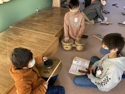 音の響きを確かめながら,カードを使って打楽器の音楽を作っています。