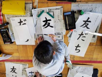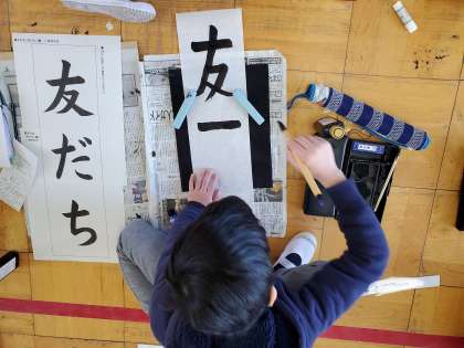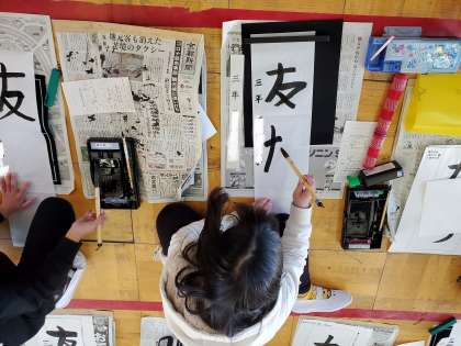 いざ書き始めると,いつもの用紙とは違い条幅だったので,難しい様子…。でも,とめ・はね・はらいに気をつけて,しっかりと書くことができていました♪