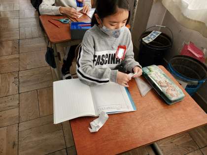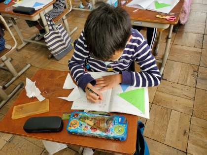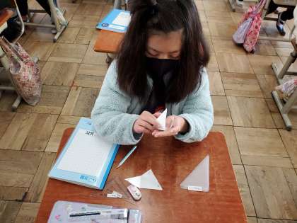 今日は三角定規の角の大きさについて調べました。三角定規の形を紙に写し取り,重ねながら調べていきました。調べていくと,辺の長さは角の大きさに関係ないことや,角の大きさは辺の開き具合で決まること等知ることができました☆