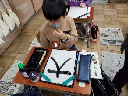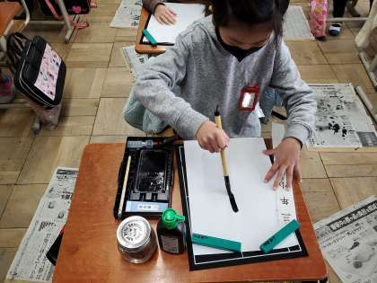 墨をすった後は,自分の書きたい文字をすった墨で書いてみました。初めてすったとは思えないほど,上手にすることができていました♪