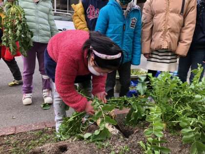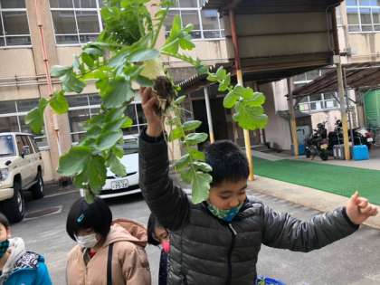 畑の大根を収穫しました。葉っぱを両手でつかんで引っ張りました。力を入れないとなかなか抜けません。やっと抜けた大根は白くてとてもきれいでした。教室に帰って長さくらべをしました。みんなで1番長いものを予想して長さをはかってみました。一番長いのは30センチメートルでした!