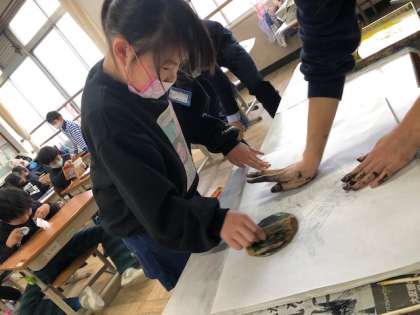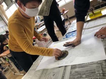 版画紙をおいてバレンですりすり〜!