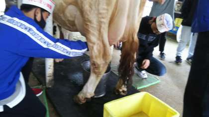 乳絞り真っ最中です!ちょっと驚きながらもコツを掴んで楽しんでいます!
