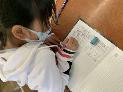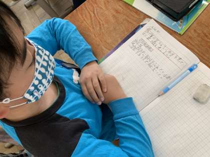 二年生のかけ算の復習もかねて問題を解いていましたが,かけられる数とかける数の関係に着目しながら考え,自分の考え方をノートに書き込んだり,発表したりしていました。