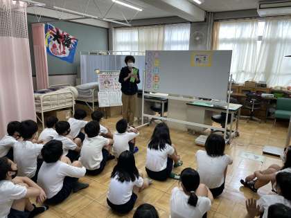 6年生になってから初めての身体計測がありました。最初は岡本先生に今年の保健目標についてお話していただき,みんなで今年一年健康に過ごしていくことを確かめました。