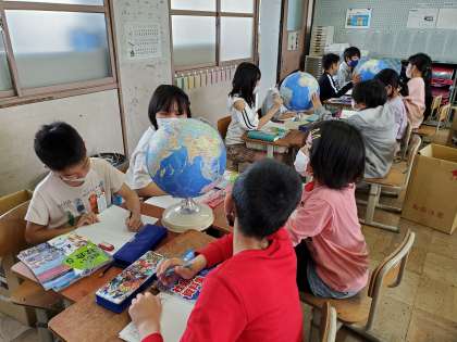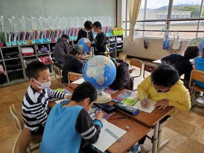 5年生の学習がスタートしました!社会科の学習では,地球儀や世界地図を使いながら,世界の国々や日本のことについて学習しています。この日は地球儀の使い方を学習しました。緯線や経線を使いながら,色々な国を探すことができていました。