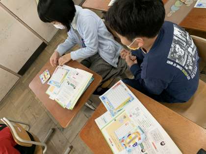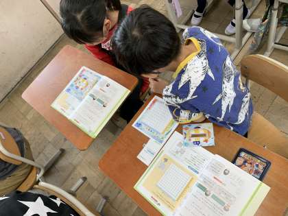 算数科の九九の表と掛け算の学習では,前後の答えを見て隠れた数字を解く「数当てゲーム」をしました。二年生のときにかけ算を何度も唱えて練習し覚えていたため,このゲームは得意げに楽しそうにしていました。二か所隠して難しい問題に挑戦している子どもたちもいました。割り算に繋げていくためにも大切なゲームです。