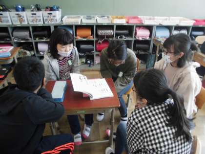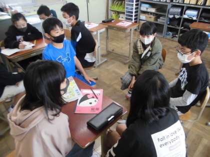 国語の授業の最初は「つないで,つないで,一つのお話」でした。最初と最後の文につなげることができるよう,グループでつないでいきました。