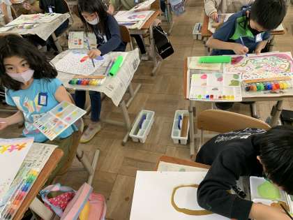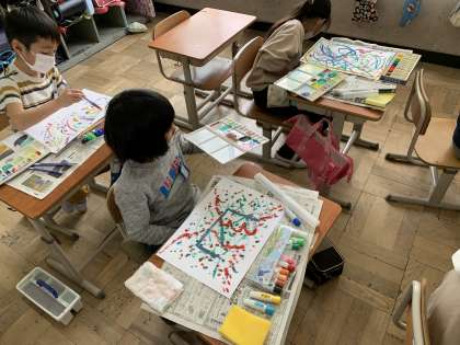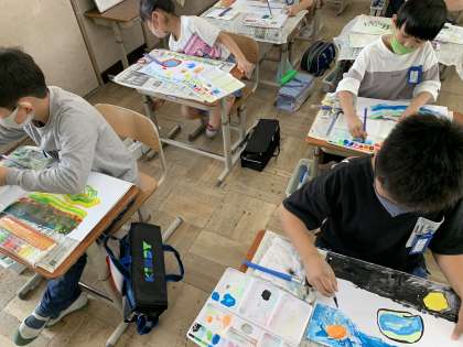 虹色の雨を書いている子や,足跡を書いている子など,自分の想像した世界を書いていました。イメージ通りの色を作るのにどれだけの水が必要か,何色を混ぜるか考えていました。