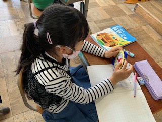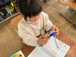 算数セットの中の時計を使って実際に動かしながら,問題を考えます。