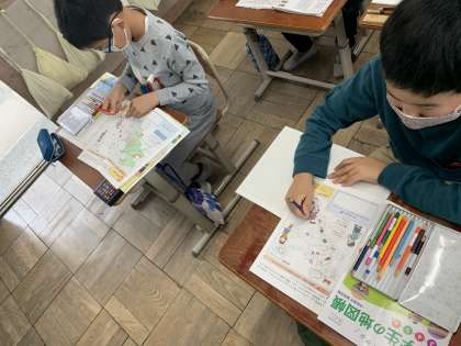 京都府の土地はどのように利用されているか考えました。「ほとんどが山林なんだ!」,「川の近くには農地や果樹園がある」など地図を見て気付いたことを発表し,みんなで話し合いました(^^)