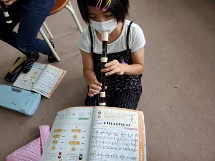 音楽では新しく,「リボンのおどり」という曲を習いました。音は出せないのですが,指使いもしっかりと練習しています。音を出せるようになって,皆で演奏するのが楽しみですね!!
