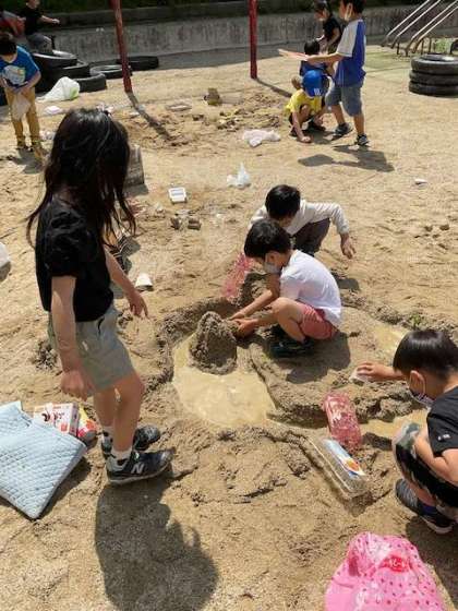 砂を丸めておだんごをつくったり,水を使って川をつくったりして楽しみました☆