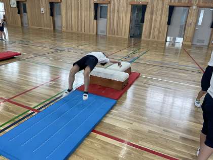 体育科で「マット運動」をしています。自分の出来そうな技に挑戦したり,友だちと見あったりしながら頑張っています。