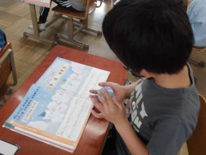 音楽科「はくをかんじとろう」の学習で,カスタネットを使いリズム打ちをしました。楽しんで学習することができました。