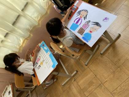 図画工作「みて みて あのね」の学習です。楽しかったことや,自分の思い出に残っている出来事を絵にしました☆