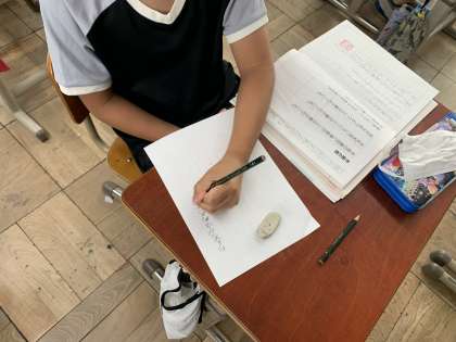 お礼の気持ちを伝える手紙を書いています。手紙の型を確認しながら,普段お世話になっている人にお礼を伝えます!はじめに書く,季節の言葉では「紫陽花がきれいな季節となりました」など,自分が今の季節でどんなことを感じるかを伝えることができるような言葉を考えています。