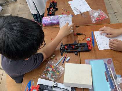モーターをはやく回したり,豆電球をもっと明るくしたりするつなぎ方はどんなつなぎ方なのか考えました。また,乾電池の向きによってモーターの向きが変わるのかも確認しました。簡易電流計も使いました。つなぎ方では,自分の考えを前で発表し話し合いました。