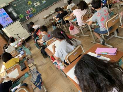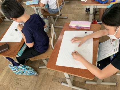6月の絵をかくのに,まずは6月といえば何を思い浮かべるのか,みんなで話し合っていました。子どもたちそれぞれのイメージがあって,友だちの意見を聞きながら「なるほど」と言いながら,絵のイメージを広げていました。