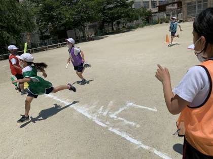 チームに分かれ,走る順番を工夫したり,バトンを渡す練習などもしています。