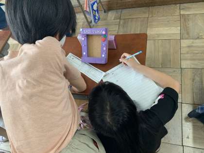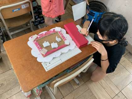 鑑賞しているときの様子です。自分のクラスだけでなく,他のクラスも自由に見に行きました。短時間でしたが,学年全員の作品を見ることができ,「こんな工夫もできたんだ」「仕掛けがあって面白い」など,笑顔で鑑賞することができました(^^)
