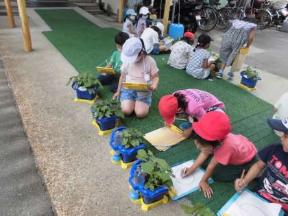 生活科「さかせたいな わたしのはな」の学習で,あさがおのふたばを観察しました。ふたばの形や模様,色などに注目して観察することができました。