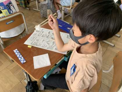 つまんだり,すくったりを実際にしてみて,自分が何が得意で何が苦手なのかを考えていました。正しい持ち方で気持ちよくご飯を食べましょう!
