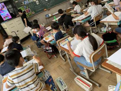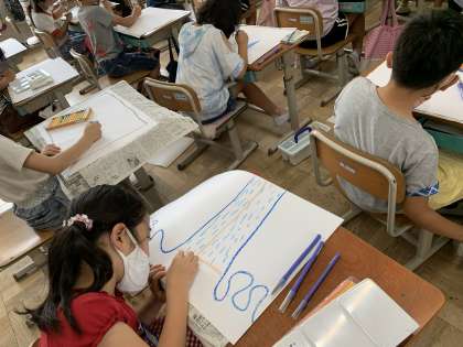 前に下書きをした6月の絵を,今日は絵の具やクレパス,クレヨンを使って画用紙で描いていきました。「黒色のクレヨンを使うとどうなるのか」「きれいなアジサイの絵はどのようにして描くのか」など,自分で考えたり,友だちのアイディアを取り入れながら絵を描き上げていきました。