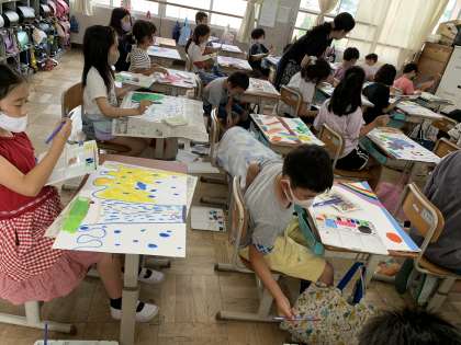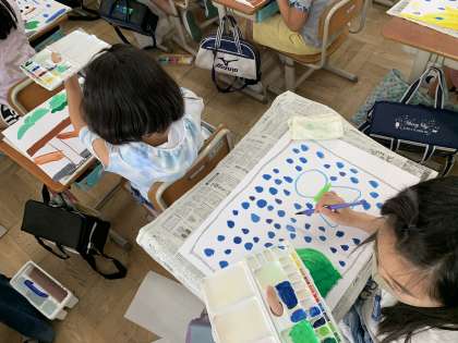 絵の具やクレヨン,クレパスを工夫して使いながら自分なりの6月の絵をかいていました。来週には完成予定です。どんな作品が出来上がるのか,とても楽しみですね。
