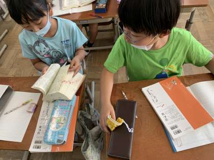 引用する方法について学習を始めました。「引用」とは何なのかを国語辞典を使いながら調べていました。教科書の発行年があることを知り,授業終わりにはさまざまな本の発行年を調べていました。