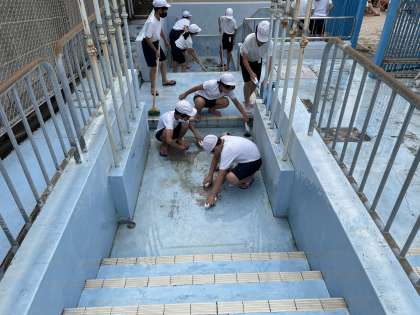暑い中,プール掃除頑張りました!!みんなが気持ちよく入ることができますように…そんな思いをこめて一生懸命頑張りました。