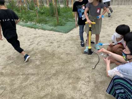 空気と水の実験でつかった、実験用具で的当てをしました!学習したことを活かして、押し出す力を調節したり、水を入れる量を調節して取り組みました!