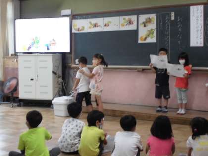 国語科「おおきなかぶ」の学習のまとめとして,おおきなかぶの音読発表会をしました。力を込めて,「うんとこしょ,どっこいしょ」上手でした。