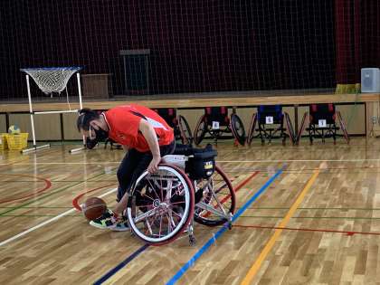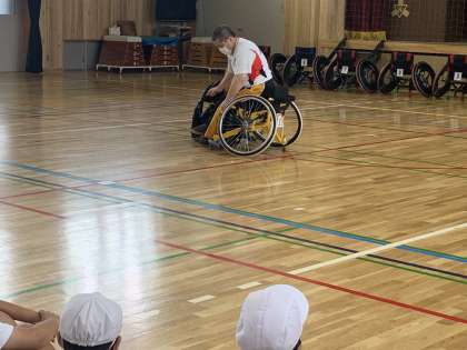 普段使われている車椅子から、競技用の車椅子に乗り換えている瞬間です。とても簡単そうに乗り換えているように見えますが、おしりをあげることも簡単ではなくトレーニングが必要だそうです。この後、競技用の車椅子で私たちの周りを1周!とてもスピードが早く、自然と拍手がおきました!