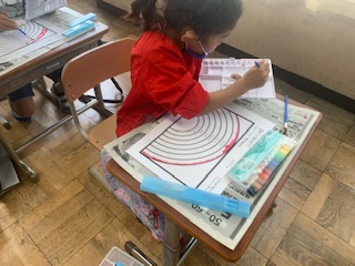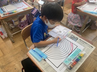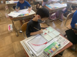 準備や後片付けはもちろん,机にどのように物を置くのか,パレットや筆はどうやって使うのか,筆洗はどうやって使うのかなど,細かいところを確認しながら,絵具の使い方を確認しました。