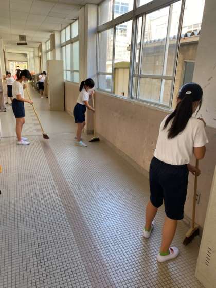 暑い…。とにかく暑い…。気持ちが折れそうになりながら,廊下を歩いていると…。そこには6年生の素敵な姿がありました。懸命に掃除をする高学年の横には,それを見て気持ちを高める低学年がいました。これが学校生活なんですね。刺激し合って,高め合っていくのが,やっぱり学校なんだなって思います。
