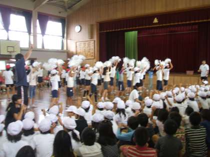 今日は,体育館で全校練習をし,どの組も力いっぱい応援練習をしました。