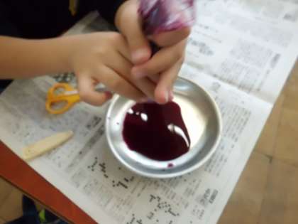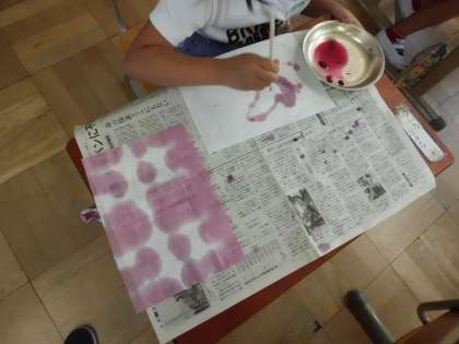 アサガオの花びらから出てくる色を使って,和紙におえかきをしました!