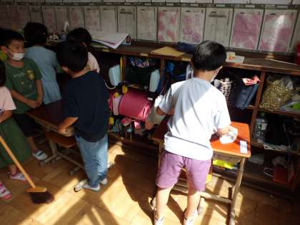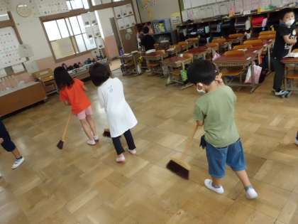 教室のほうき係,つくえ係たちが協力して,お掃除を頑張っています!