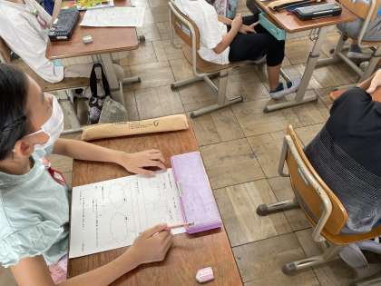 「ゆかいに歩けば」の演奏をきき、感じたことや聞きとったことを交流しました。「朝に聞きたい曲だな」「後進したくなる」や「たいこやバイオリンの音がきこえたよ」など自分が思ったことをたくさん交流することができました。また、曲が変化するところの違いにも気づくことができました。