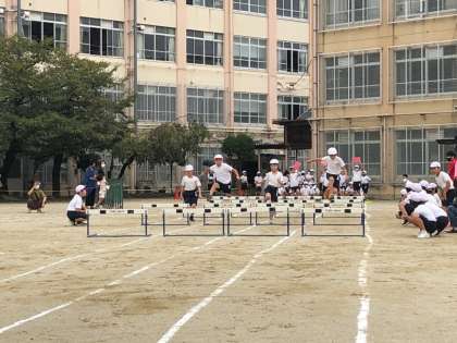 体育科学習発表会が無事終わりました!!夏休み明けから,少しずつ練習してきた成果を発揮できたと思います。4年生らしく,元気いっぱいの全力で取り組むことができました!!ハードル走では,「トン,1,2,3」のリズムに合わせて全力で走り抜けることができました!1組の様子です。
