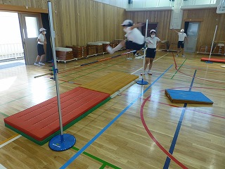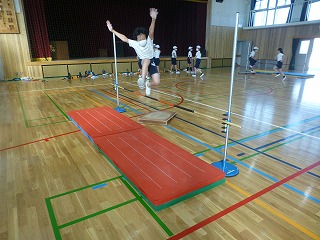 体育では,走り高跳びの学習に入りました。自分の目安の記録を設定し,そこからどうすれば記録が伸びるのか考えながら学習を進めています。