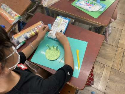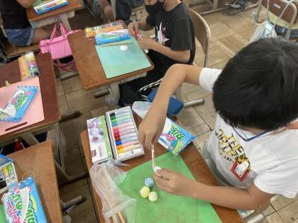 自分や周りの人が元気になるお守りを作りました!はじめは,元気といえばどんなものを思い浮かべるか話し合いました。「ワクワク」,「明るくなる」や「色は黄色や赤が元気な感じがする」など,みんなそれぞれ考え方や感じ方が違うねと話し合っていました。早速色粘土を作って,元気をイメージしながら作りはじめました。